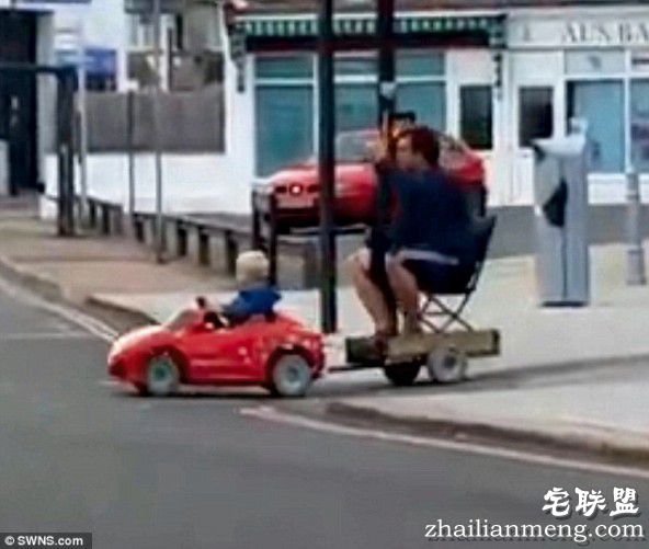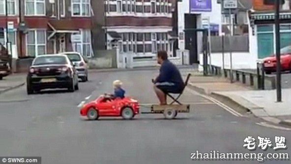 平常看到父母亲开车载着孩子,这是再也稀松平常不过的事情,上周日在英国街头,竟然出现一名小男童,开着红色的电动玩具车上马路,后面还拉着坐在板车上的父亲,他帮忙充当指挥。