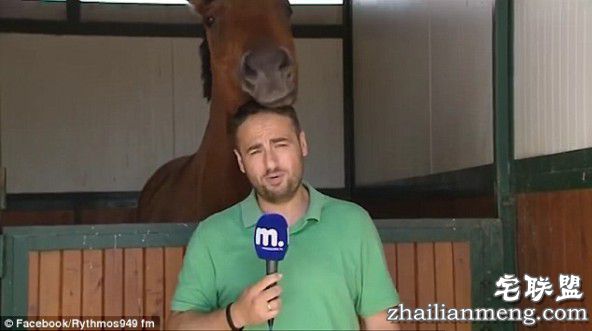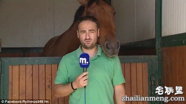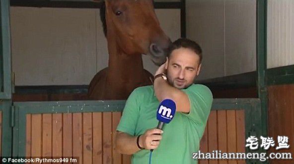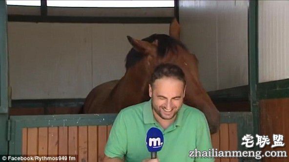 希腊新闻记者直播时后面的马凑了过来闻闻话筒:我能说几句不?
