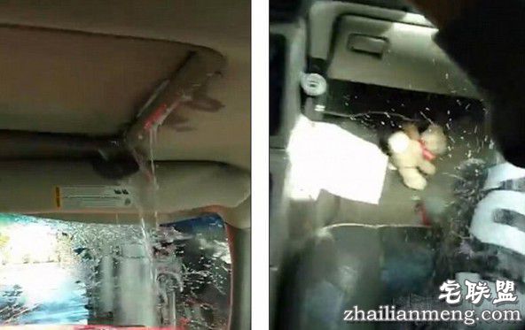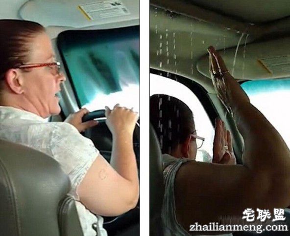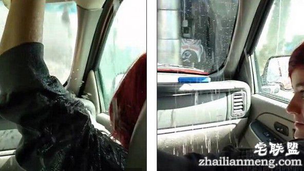 坐在副驾驶的女孩赶紧找了一块毛巾试图堵住天窗露的水,但无济于事,因为天窗的水是从各个地方露的,堵住一个地方没用。