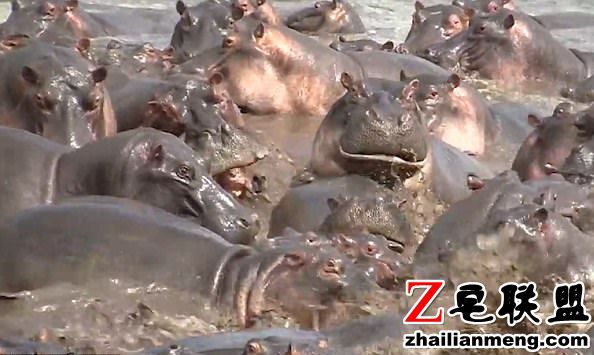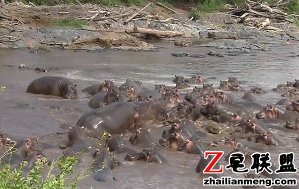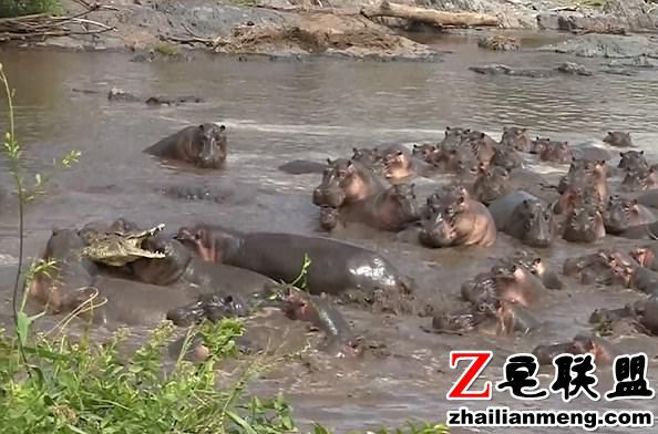 途经河马池时,赫然发现一条鳄鱼潜入池中,企图突击幼小的河马宝宝,没想到惨遭30多头河马围攻。