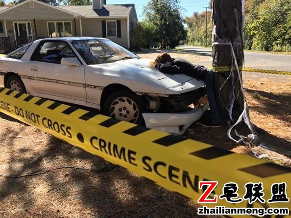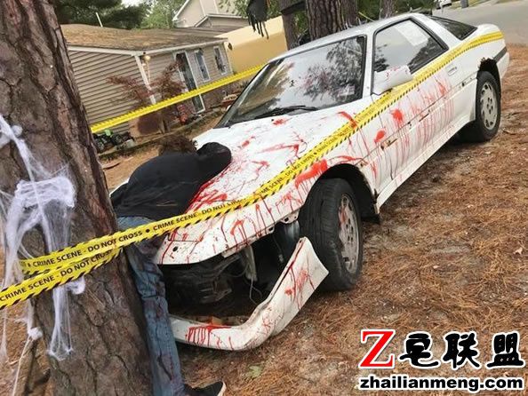 美国新泽西州一对夫妻Kevin 和Krysten Negrotto 日前为了过万圣节,在家门口布置一个恐怖的“车祸现场”。