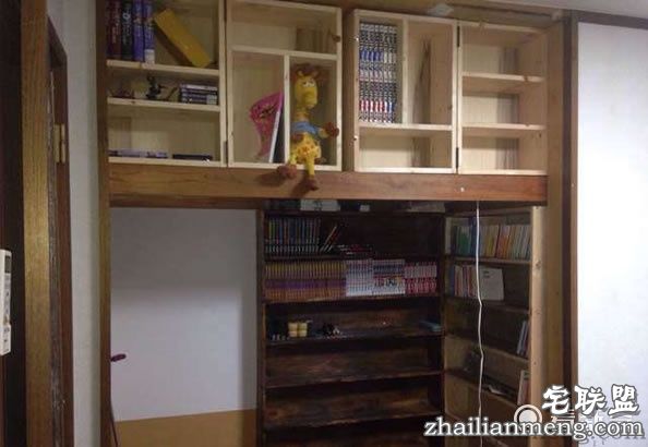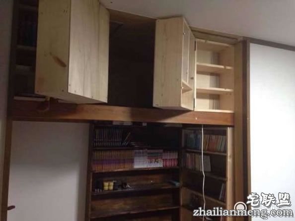 第一张看似普通的柜子,正是网友的秘密空间,但你一定找不到其中的机关。 原来网友在上层收纳柜中,加装活动式书柜,因此书柜变成可开式。