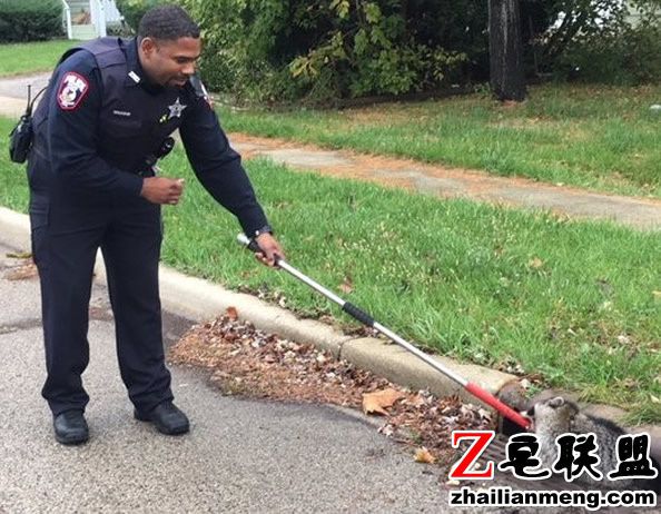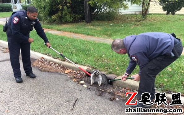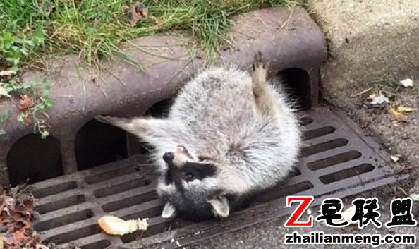 美国伊利诺伊州的一间警局Zion Police Department 日前接到报警,马路上有一只肥肥的小浣熊似乎是伙食太好,卡在排水沟的隙缝中动弹不得。