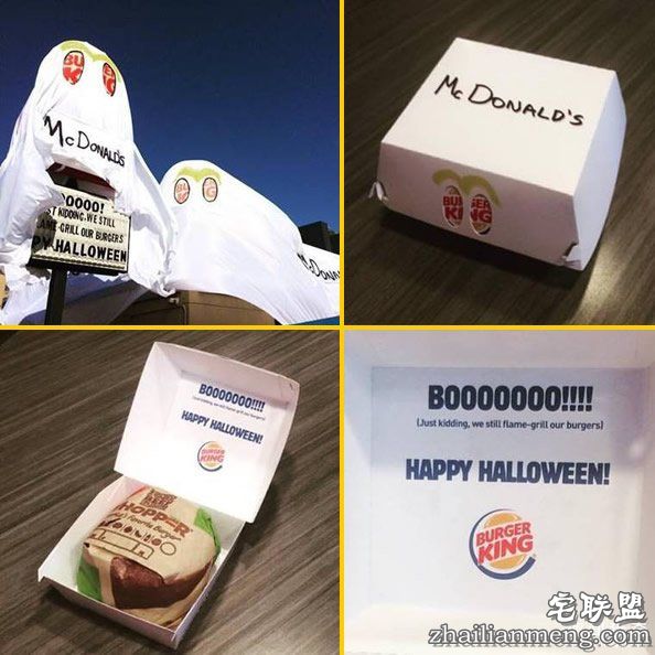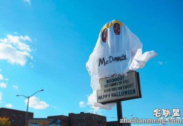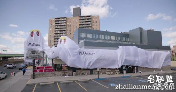 位于纽约皇后区的汉堡王,为了万圣节,大玩“反串”,在招牌上盖上大大白布,挖了两个洞,搭配黄色的M字,写上McDonald’s。