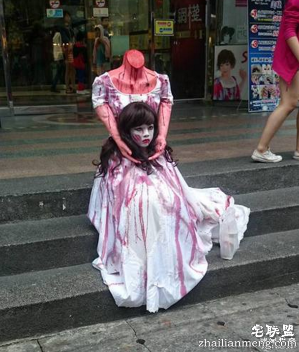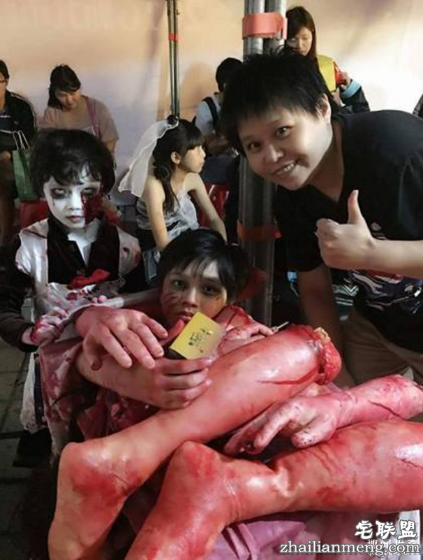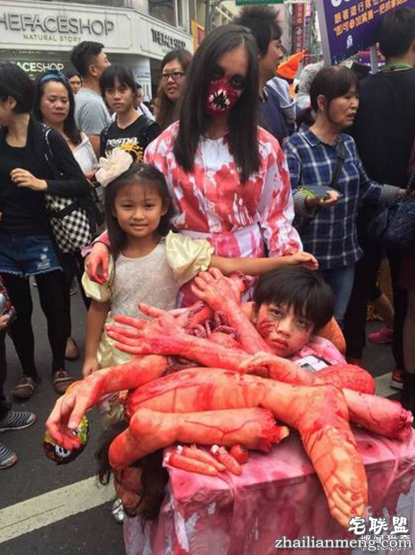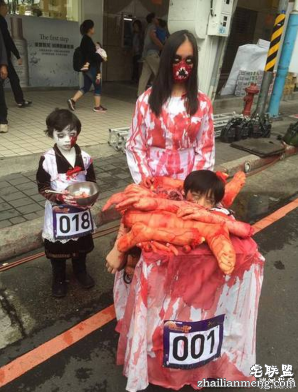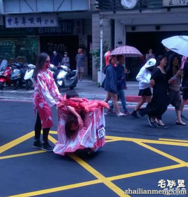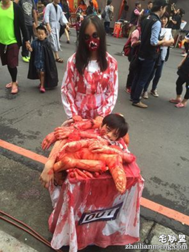 没想到竟然会有人装扮成「血淋淋的人肉餐车」?!里面有男孩的头,后面还有女孩在推车,简直就是从电影里出来的啊!但这个到底是谁呢?