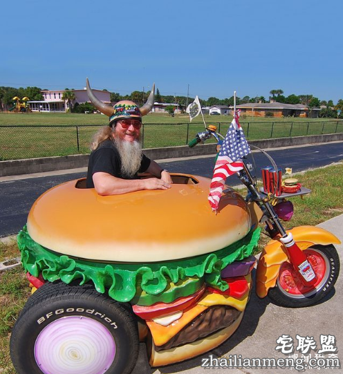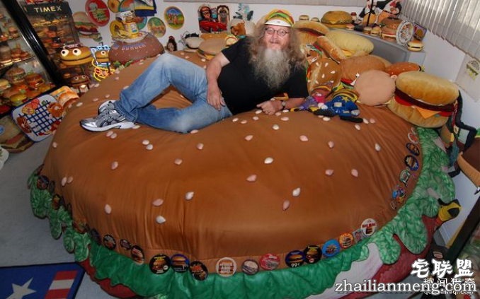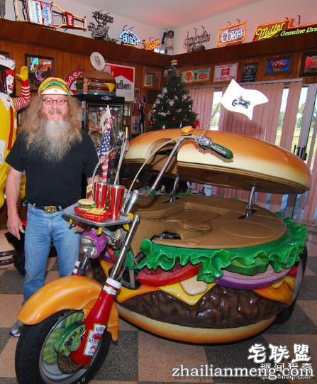 Harry收集了超过一千种汉堡的相关周边物品,其中甚至包括一台巨大的机车和一张汉堡形状的床。机车特写