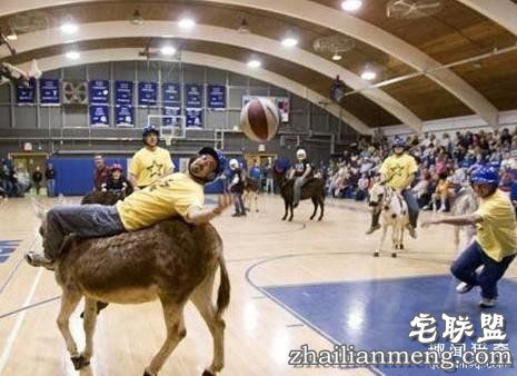 2009年5月,美国爱荷华州举行了一场别开生面的骑驴篮球大赛,即骑在驴子上表演篮球技巧,场面十分搞笑,据悉,这场比赛引起了动物保护组织的强烈不满。▼