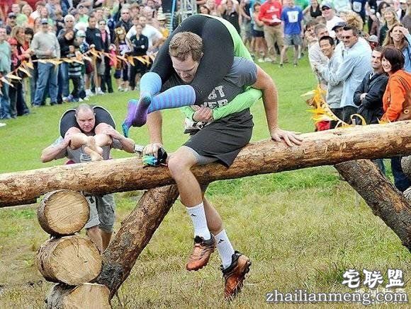 男性选手背着一个女人,通过沿途的障碍物,时间最快的一对获胜▼