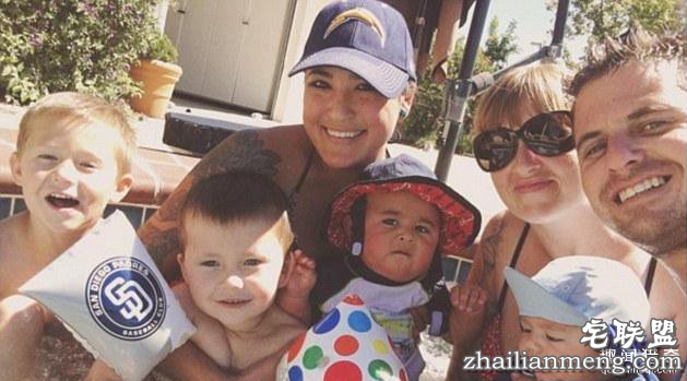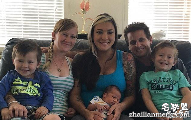 罗斯与前女友重建联系后询问过丈夫巴迪的意见,巴迪认为这件事很酷,欣然接受。图为一家六口,从左到右分别为:欧文、詹姆斯、劳伦抱着孩子达米安、罗斯抱着孩子瑞恩、以及丈夫巴迪。