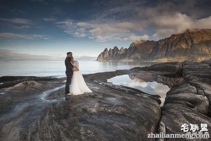图为新娘在挪威的巨舌岩(Trolls tongue)。