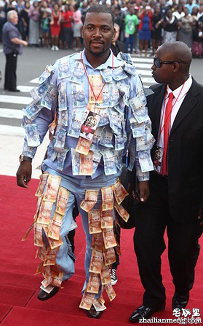 炫富方式千百种,但绝对没有人能像下面这位南非土豪德里米(Michael Andile Dlamini)一样俗不可耐,他靠着卖草药,赚进大把钞票,是当地超级有钱人,于是他为了炫富,开始穿上真钞制作的服装招摇过市。对此疯狂的行为他表示,是为了感谢那些送钱给我的人们!