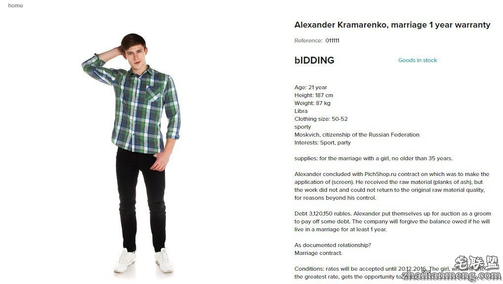 这位遭拍卖的21岁的俄罗斯帅哥,叫做卡马兰可(Aleksandr Kramarenko ),只要是任何35岁以下的女性得标,网站拍胸膛保证,说至少会与你结婚一年(保固期一年),该商品起标价为10,000卢比。