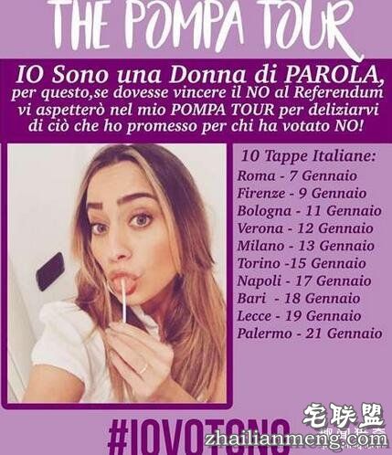 ▼后来公投法果真以反对告终,伦齐也引咎下台。在结果出来后,宝拉就火速在个人网站上贴出了口爱之旅的「时间表」,强调自己绝对会信守承诺,为选民展开口爱,才不会像玛丹娜替希拉蕊助选时那样说话不算话。