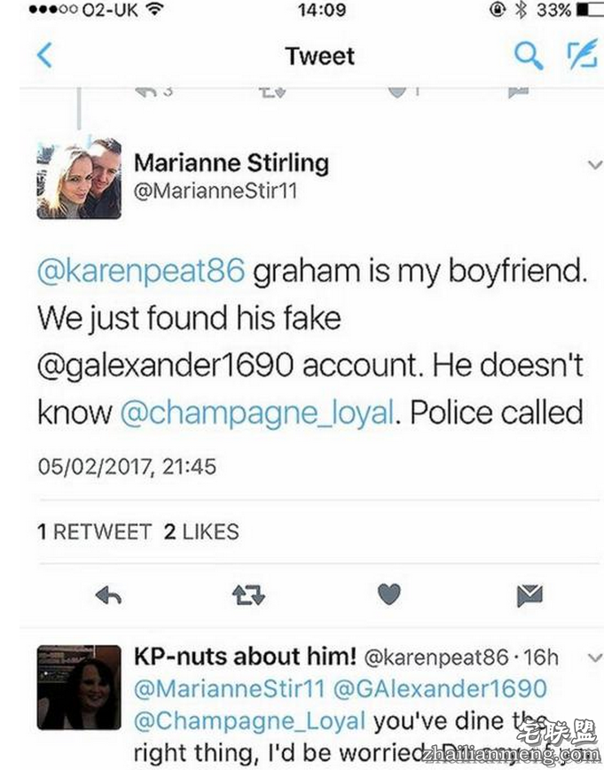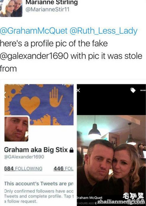 格雷厄姆是我的男友。我们刚发现了他的假帐号。他不认识这位女人。已经通知警察了。未婚妻说。