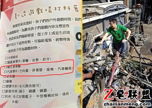 照片中,这位爸爸还蹲在一堆二手汽车零件当中,认真地找寻适合的零件。