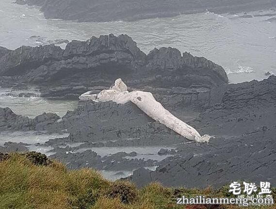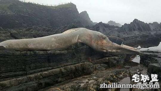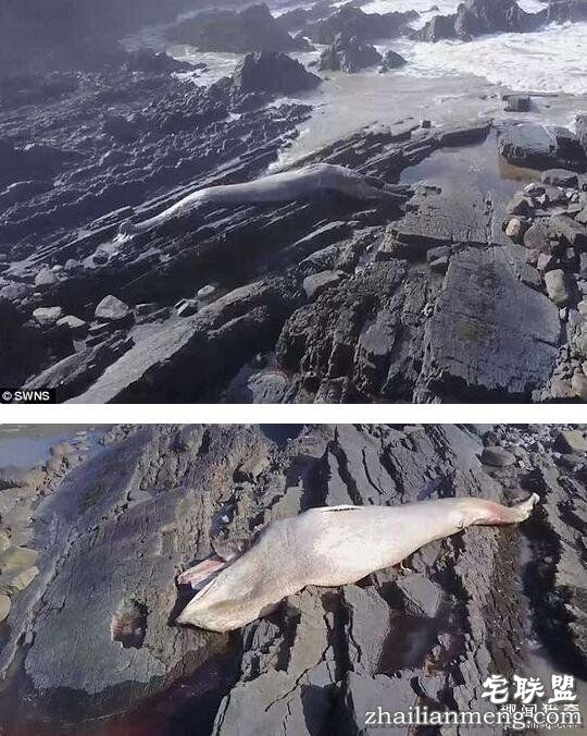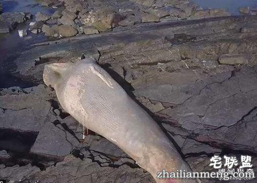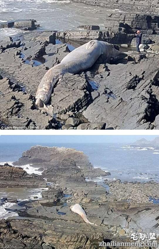 这只长须鲸被海浪冲到岩石上,又被海水冲击得越来越远,最后出现在了这里。