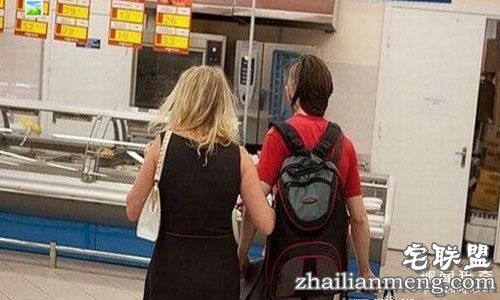 视频中,一位美艳的金发年轻少妇和老公来到超市购物。