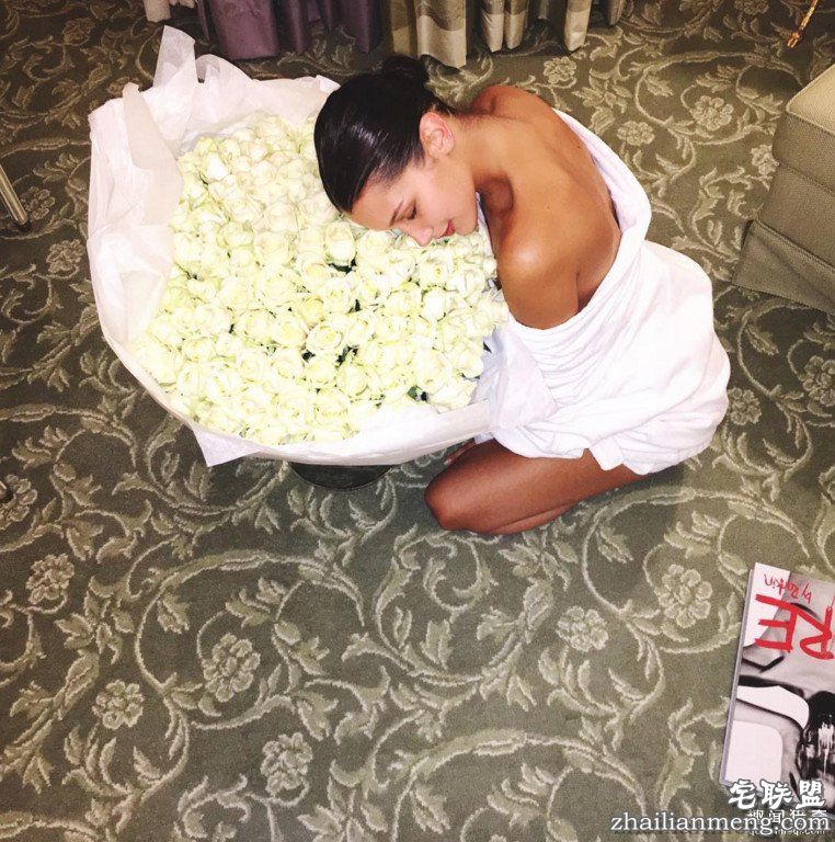 贝拉穿少必拍、穿多也拍,跪地收下花束是绝招,当网友以为她在晒收到的超大花束时,一跪用画面叁分之一的版面炫大腿,私照也展示超模强大的抢镜功力。