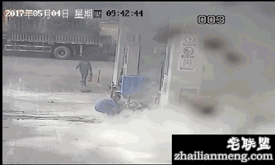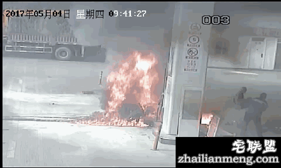 加油员大喝一声“你要干啥?”随即抄起身边的灭火器冲着着火摩托车实施灭火,男子却推起燃起火焰的摩托车撞向加油机旁的水饮堆头。汽油溢出,火焰迅速蔓延,现场形势危急!