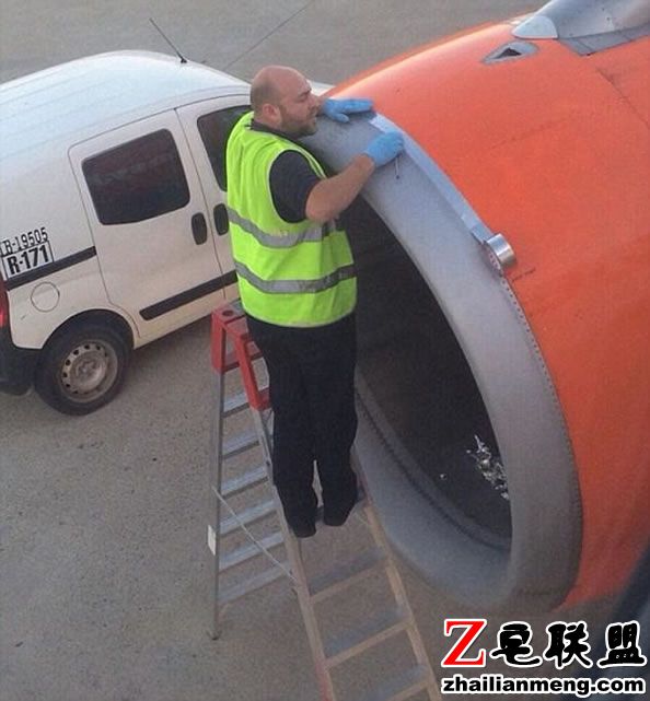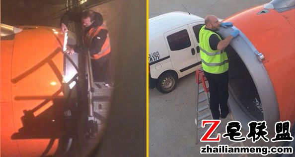 图中可见一名维修员爬到梯子上,站在机翼旁将引擎边缘旧胶带撕了下来,接着换上了新胶带,临时紧急维修经过让坐在窗边的乘客看傻。