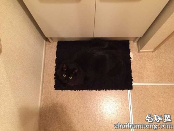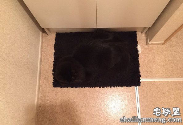 而刚好浴室内的地毯也是黑色,材质是绒毛布,黑猫躺在上头完完全全看不见,俨然跟毛毯融为一体,主人自己差点也没注意就踩了下去。