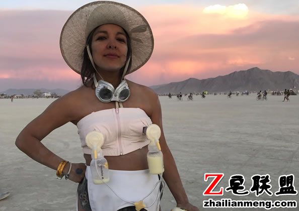 Agrawal 趁着祭典传递做母亲的辛苦,索性穿著补助哺乳的内衣在一场艺术祭典“火人祭”会场内走动。