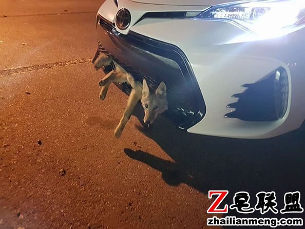 直到她在路口停等红灯时被一名慌张的女子拦下,她下车后才惊觉这只小郊狼竟卡在她的车子前方保险杠下。