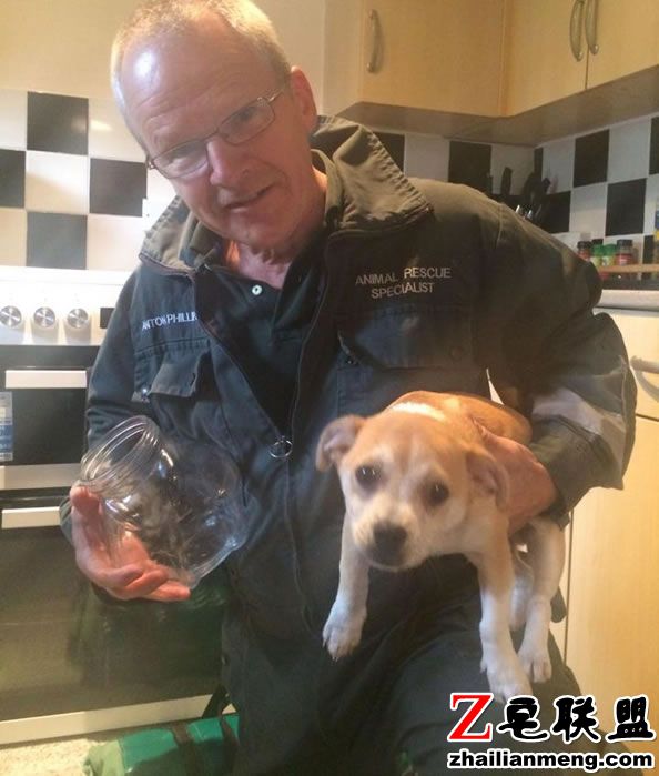 主人Patrick Rebbeck 的2位女儿当天在厨房吃饼干,吃完把饼干罐顺手放地上,Buddy 被卡在里面大概一个小时。