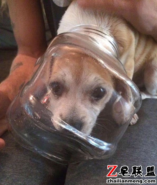 英国Southampton 一只5个半月大的吉娃娃Buddy 很贪吃,想把玻璃罐里的饼干屑舔干净,把整颗头伸进瓶内,结果却卡在罐子里动弹不得。