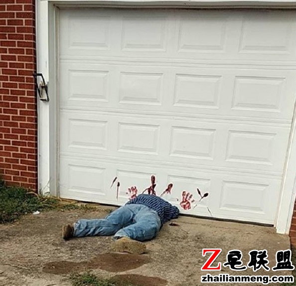 此外,白净的车库门上还印满了鲜红色手印,就像是真的犯罪现场。