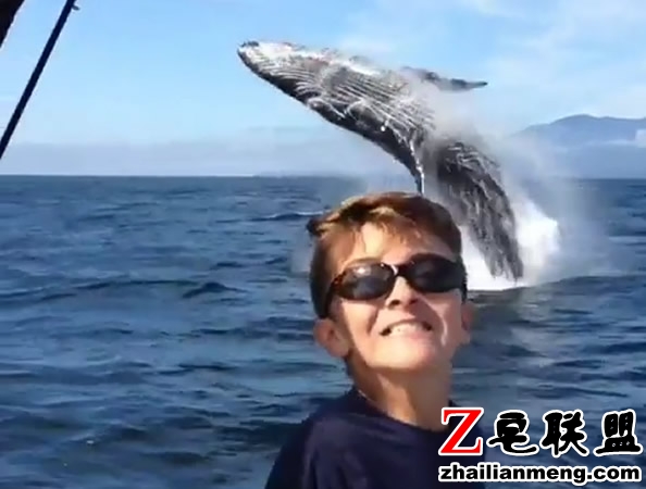 加拿大有位小男孩搭上一搜捕鱼船,结果刚好遇到巨大鲸鱼跃出水面的模样,开心的他赶紧转头要爸爸赶紧帮他拍照。