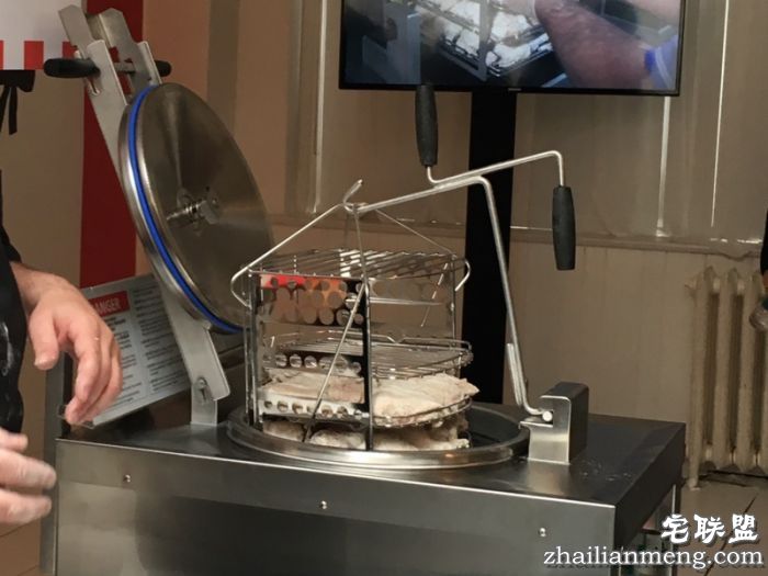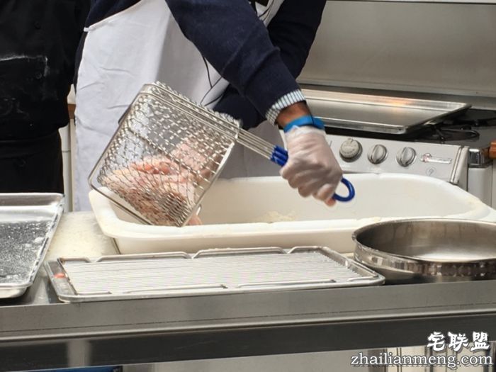 将鸡肉上架,肯德基的炸鸡都是放在特制的架子上炸制的,这样能保证每一块都受热均匀。炸的时候注意鸡翅尖的地方,这块地方最容易炸糊。