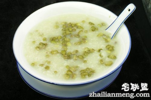 100克绿豆、100克粳米加适量清水一同煮成粥。