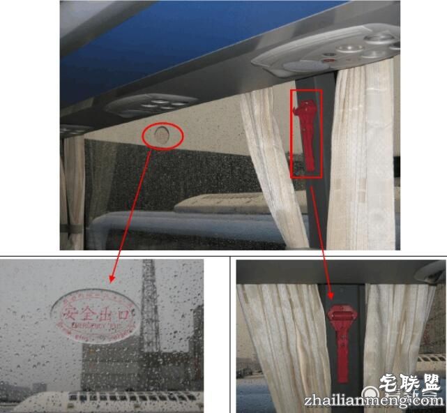 1。位置:凡标有“安全出口”标示的车窗均可用逃生锤敲碎(没有标示的则不可),逃生锤均固定在“安全出口”车窗的旁边。前后共4组。