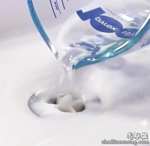 洗脸盆堵住后,将苏打粉和盐混合均匀,倒进出水口中,然后将醋倒进去。