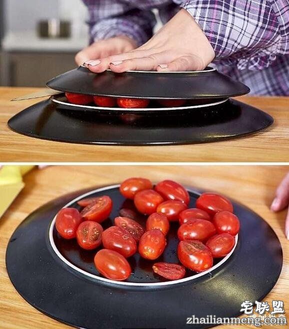 ▼1.一次将所有樱桃小番茄切成两半:将樱桃小番茄放在盘子中,上面盖一个盘子,用一把锋利的刀从中间平切。