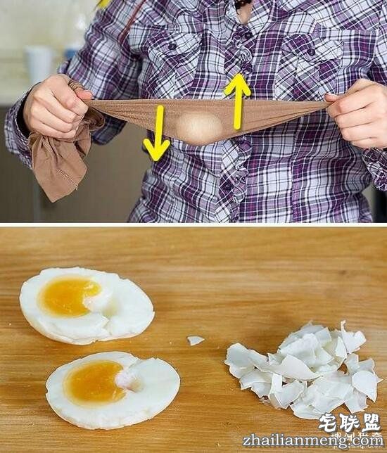 ▼12.「蛋白蛋黄换位」煮鸡蛋:用胶带将鸡蛋缠住,将丝袜展开,鸡蛋塞进去;丝袜两端打结,固定好之后手提丝袜两端,开始用力旋转,2-3分钟后蛋黄和蛋白混合到一起,放入水中煮大约10-15分钟就好了。