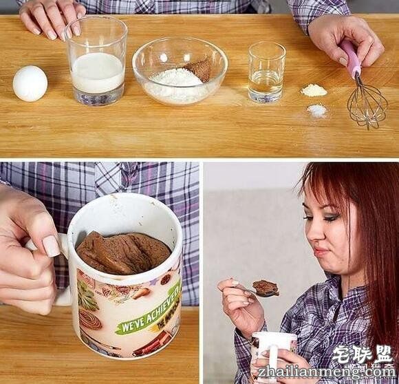 ▼3.微波炉制作杯子蛋糕:把鸡蛋、面粉、糖、可可粉、泡打粉、盐混合,搅拌均匀后放进微波炉加热。