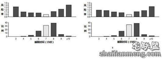 不同睡眠时间对女性(左)和男性(右)死亡风险率的影响。风险率以每晚睡眠7小时的群体死亡率为基准,数值每高0.1则意味着死亡率高10%。