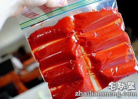 做菜的时候只会放一点点番茄酱,但瓶子里剩下的那部分很容易变坏。如果想让它保持新鲜,就把剩下的番茄酱放入密封好的塑料袋中,并如图分出一块块区域,想要再用的时候,挤出一小块就可以了。
