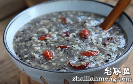 原料有:粳米500克,黑芝麻适量,红枣若干,糖适量。将黑芝麻炒香,碾成粉,待锅内水烧热后,将粳米、黑芝麻粉、红枣同入锅,先用大火烧沸后,在改用小火熬煮成粥,食用时加糖调味即可。芝麻甘平,有补肝肾、润五脏的作用。此药膳芳时扑鼻,甜润可口,具有补肝肾、乌发等食疗效果。