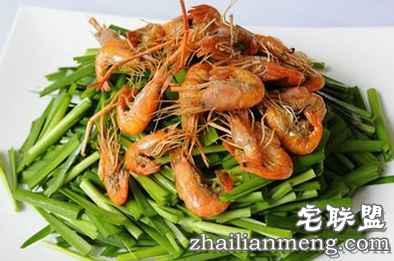 原料有:鲜虾250克,韭菜适量,生姜3片。先将虾去肠去壳,然后爆香姜片,放入鲜虾炒熟。最后放入韭菜略炒,与虾一起上碟即可。虾性味甘、温。蛋白质含量为16.4%,脂肪以及糖类,无机盐,菸酸,维生素A、维生素B1、维生素B2。虾有下乳汁,壮阳道的作用,是一种强壮补精药。此菜可治肾虚、阳痿等症。