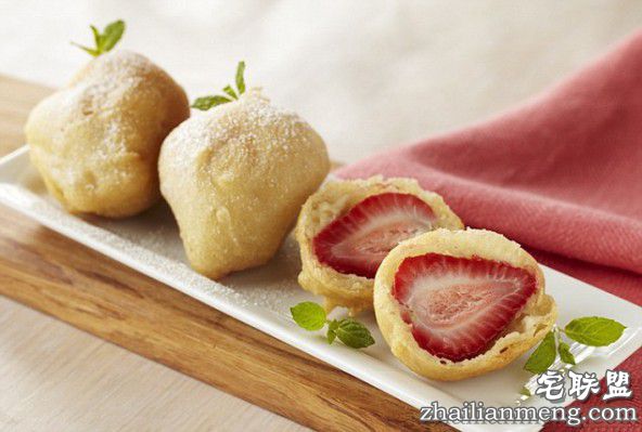 油炸草莓。做法:把黄油和鸡蛋,面粉和牛奶和在一起,然后用草莓蘸了之后要迅速转移到炸锅。不到30秒,米色的出现捞出来,然后蘸糖粉,看起来更漂亮。