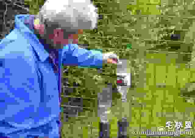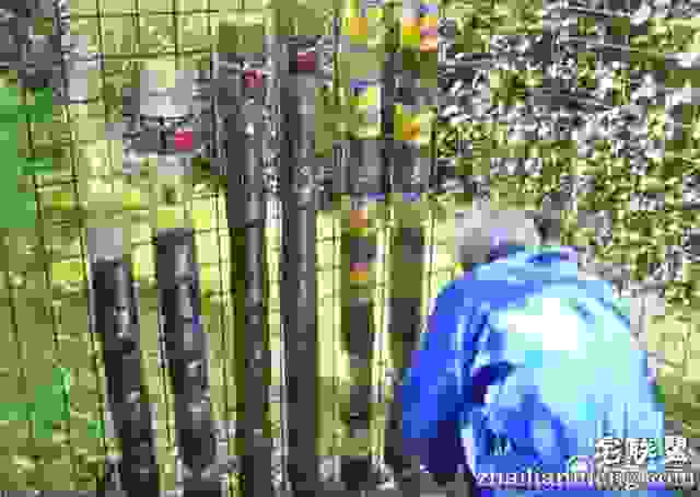 他把可乐瓶的底部用刀割掉,把瓶盖拧掉。然后把一个可乐瓶的头部插进另一个可乐瓶的底部,把它们这样一个一个的摞起来。用铁丝固定在铁栅栏上。