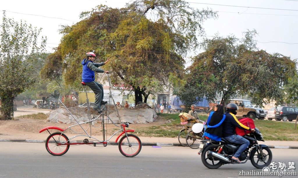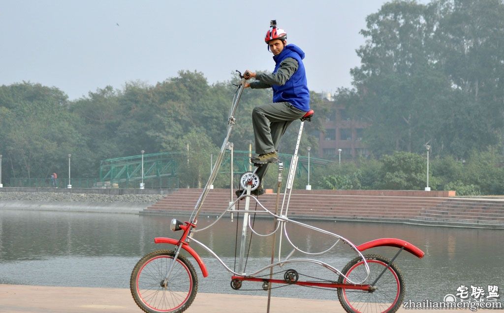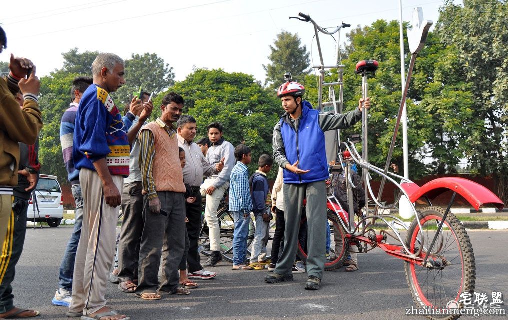 ajivKumar来自昌迪加尔,自己设计2.5米高自行车,伸展开长度是3米多。