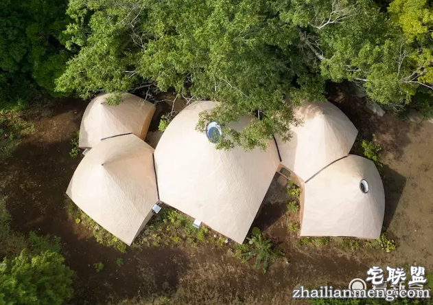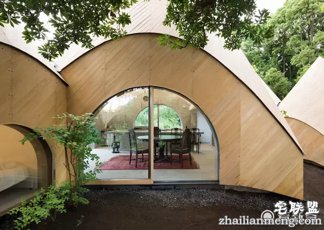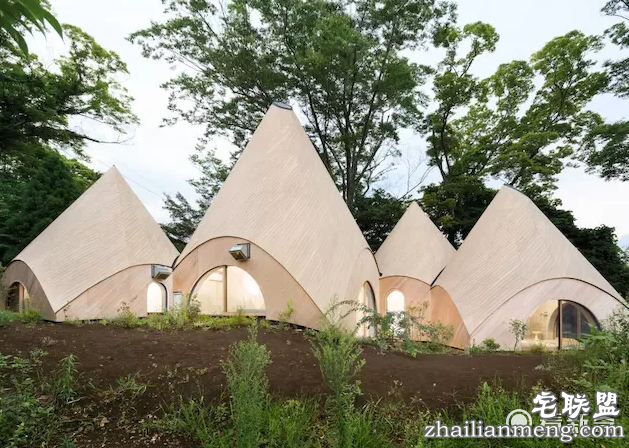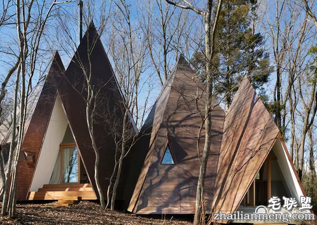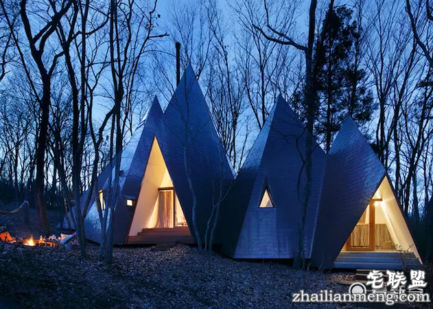 但这些仿印第安人帐篷或日本绳文时期竖坑式住宅的建筑体,造在山林之间,因为木质外墙以及古意造型的共同作用,也减弱了其违和感。