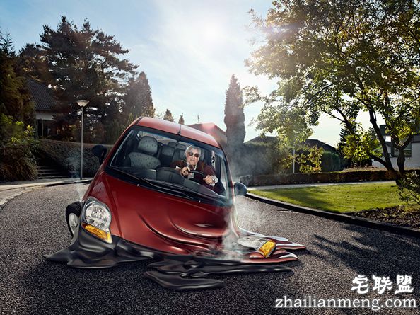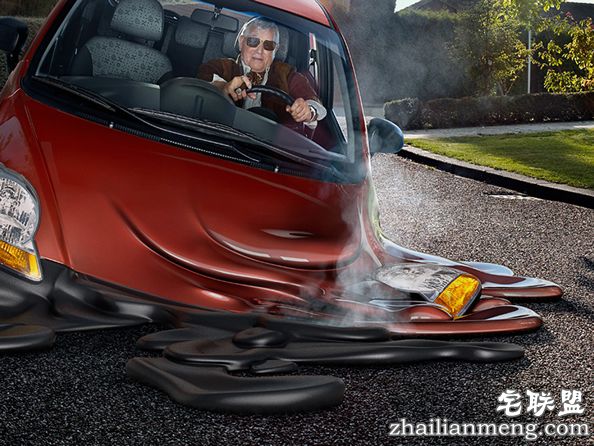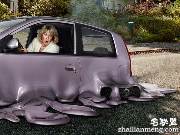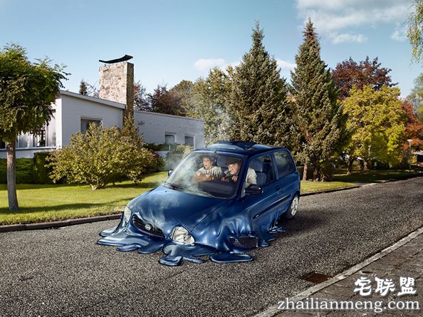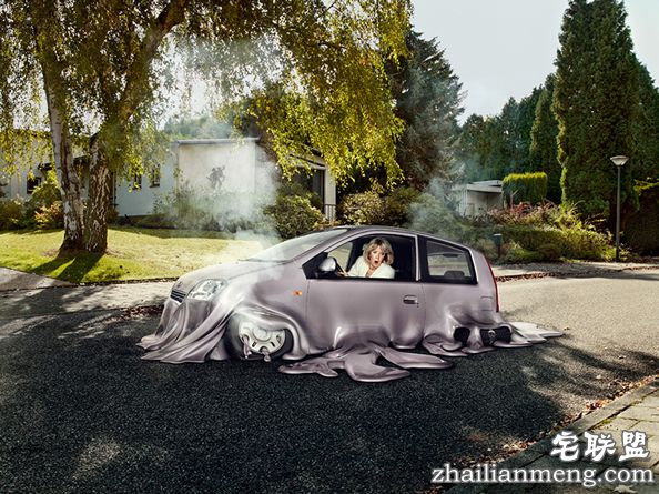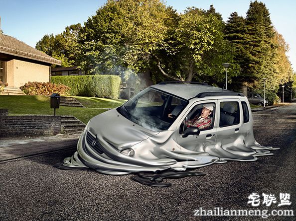 首先,摄影师maarten de groot 拍下汽车在路上的照片,然后交给luminous creative imaging 团队进行后期处理。经过处理后的图片为我们呈现了一系列超现实主义的场景,即汽车突然在柏油马路上开始融化,路过这片郊区的司机和行人都不可思议地看着眼前的这个场景。