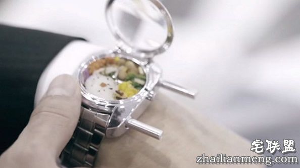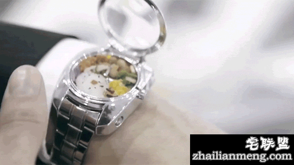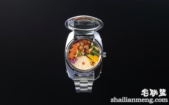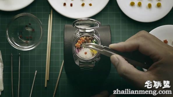 独一无二,仅此一件,因其本身是一个广告创意盒饭手表里面的菜是由整形外科医生来切,由知名的厨师烧制,再有模型发烧友将饭菜放入这个直径只有30毫米的盒饭手表里。