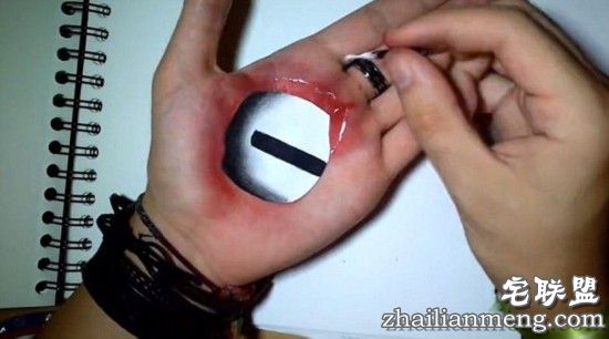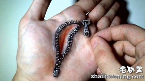 法国艺术家约旦·莫利纳(Jordan Molina)的一组手掌上的3D绘画作品曝光,其在手掌上所描绘的作品栩栩如生,包括拉链、蝴蝶、眼睛、蝴蝶等等艺术作品。图为“拉链及伤口”。