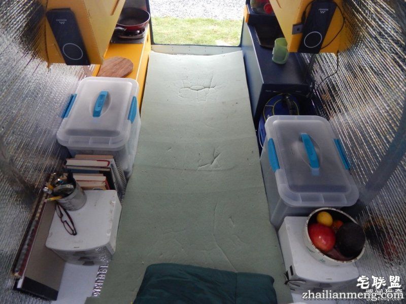 经过长时间的不断改善和慢慢将尾厢空间充分的利用起来,可以看到。这个只有一张床位置大小的自行车拖厢空间里面,左右两侧分别放置了煮食用的厨具,储物箱甚至是水果拼盘。